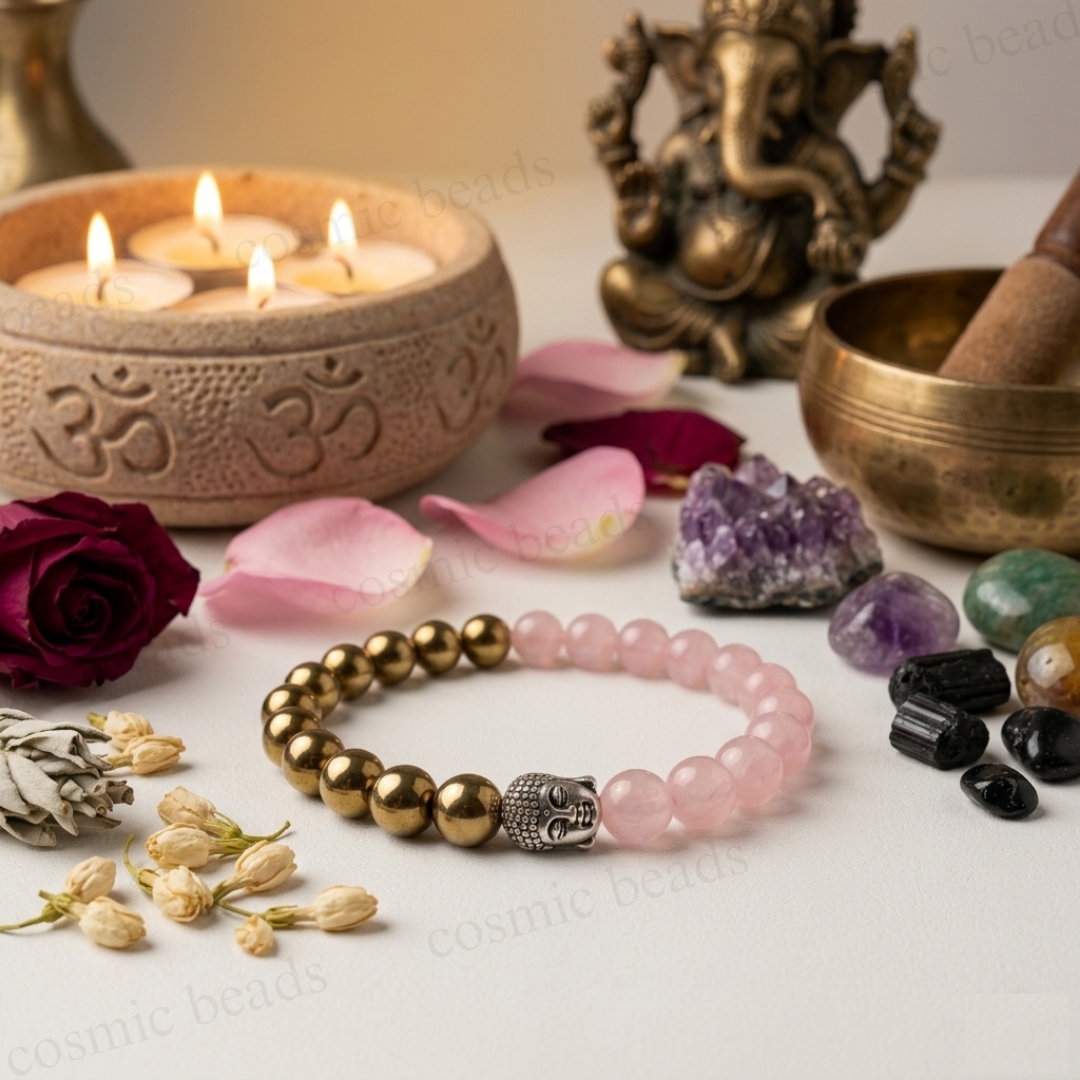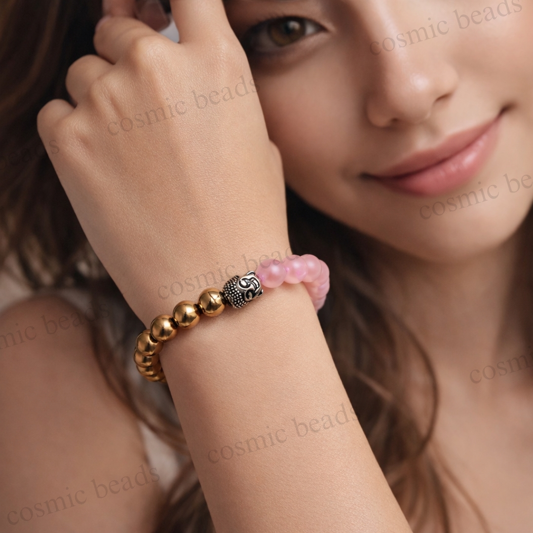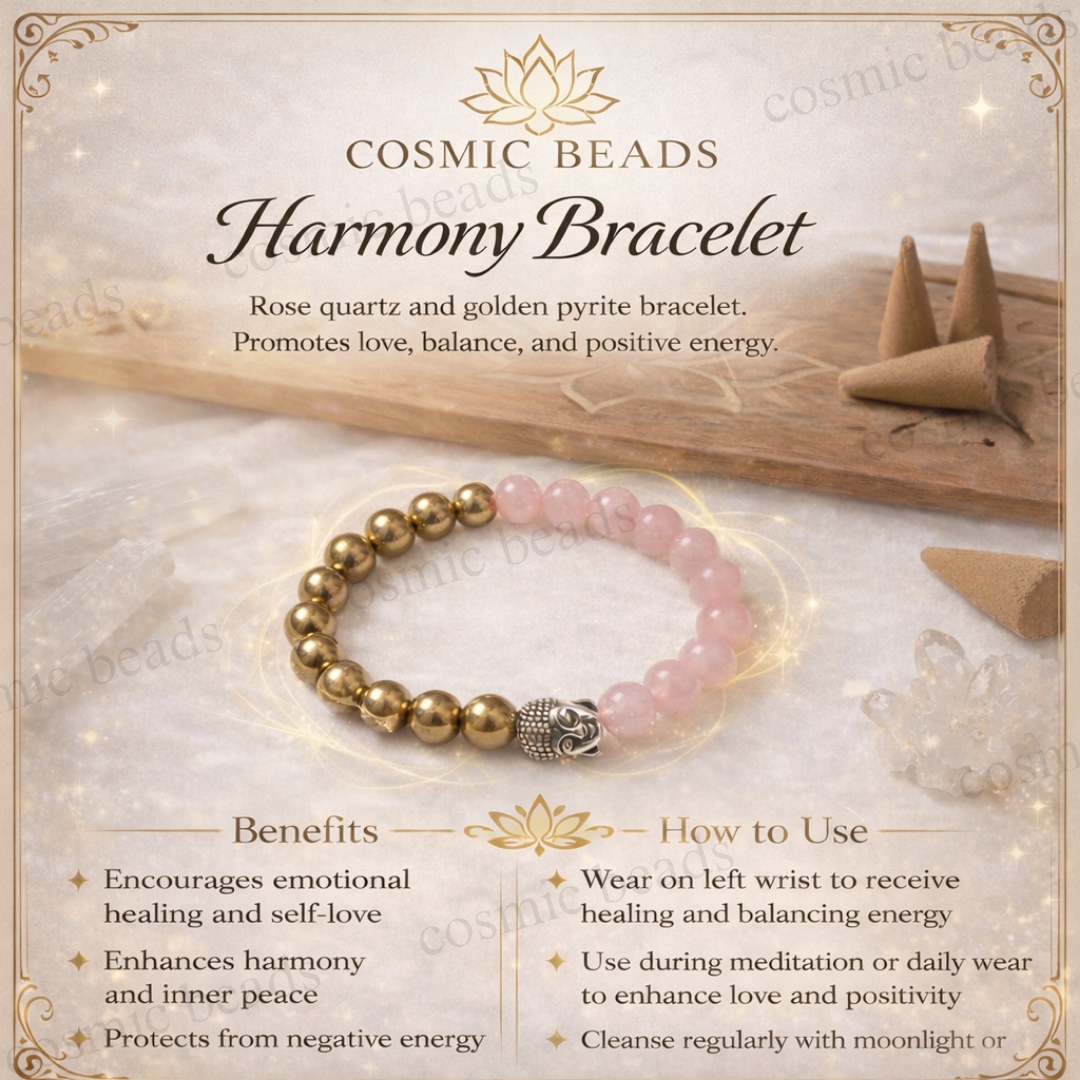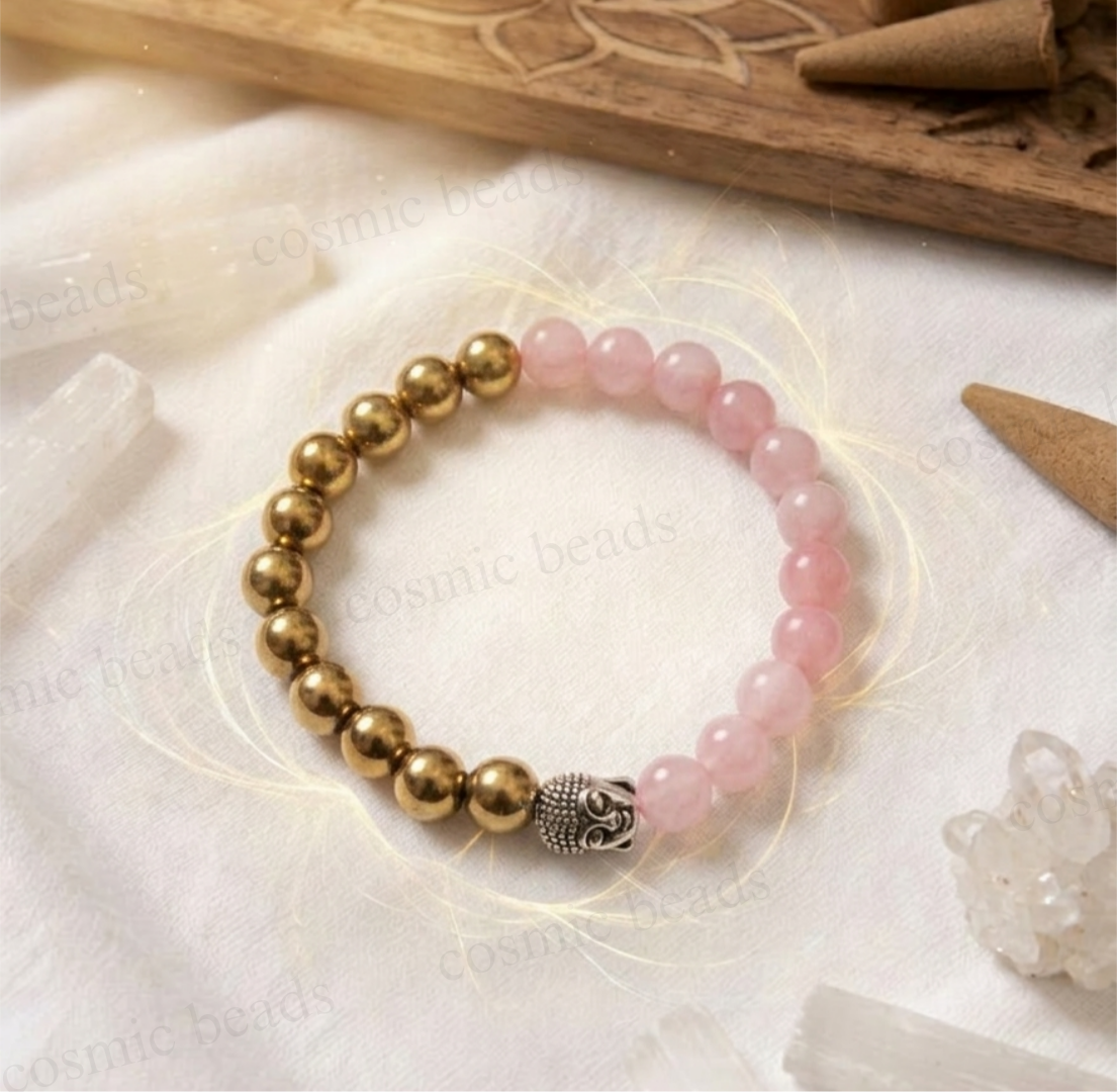 Elevate your energy with the perfect harmony of love and prosperity. This handcrafted bracelet by Cosmic Beads combines the soft, nurturing essence of Rose Quartz with the bold, protective fire of Golden Pyrite. It is more than just jewelry; it is a wearable tool designed to align your heart’s desires with the power of manifestation.